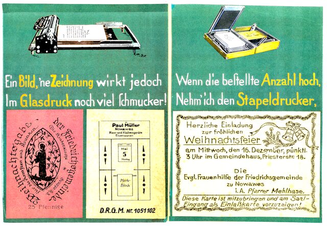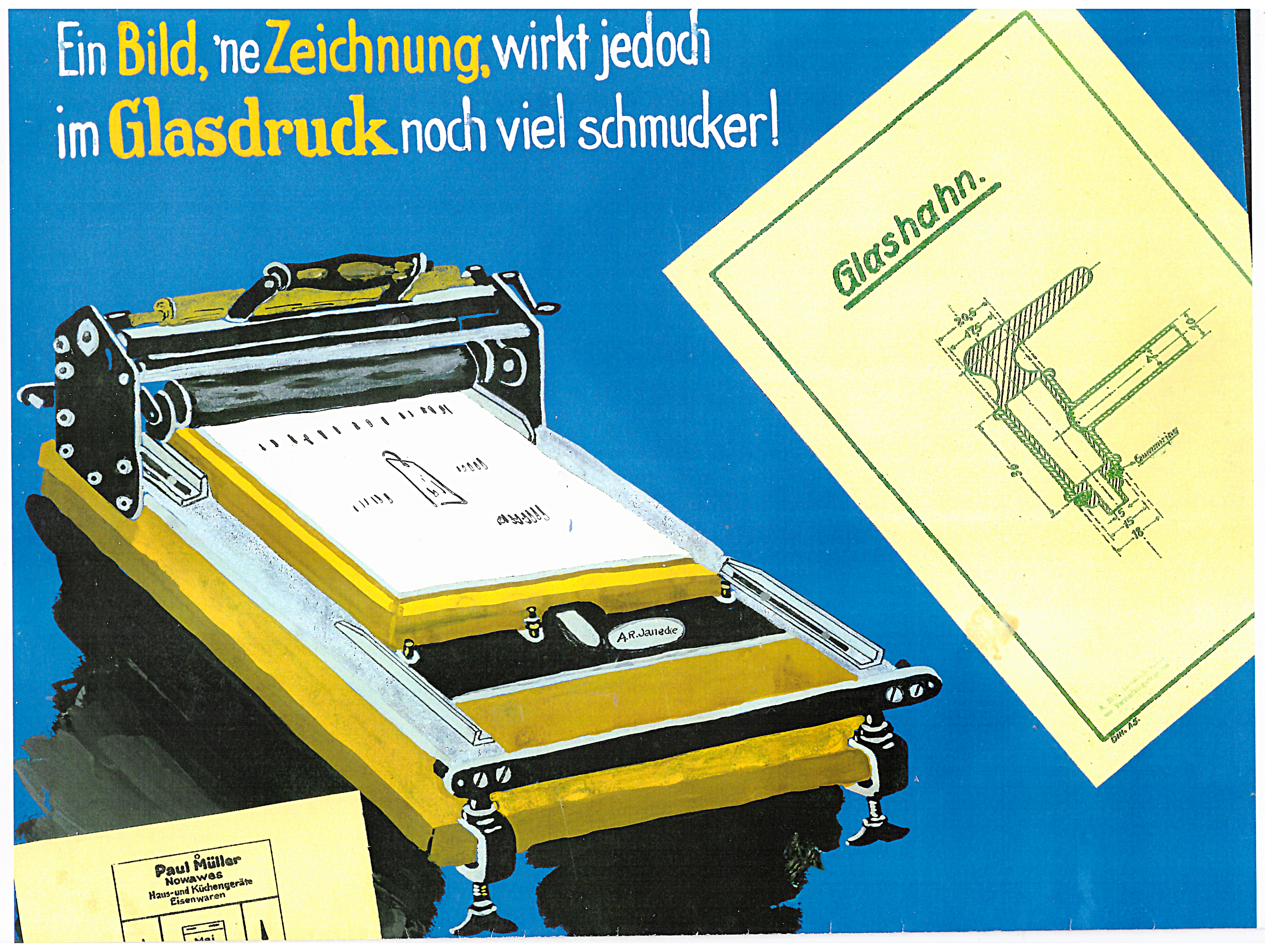 Die Kopien von Schriftstücken oder Zeichnungen mit höchsten Forderungen an die Qualität, werden auf dem Glasdrucker hergestellt. Die Farbigkeit ist nach nunmehr rund 100 Jahren ausgezeichnet erhalten.