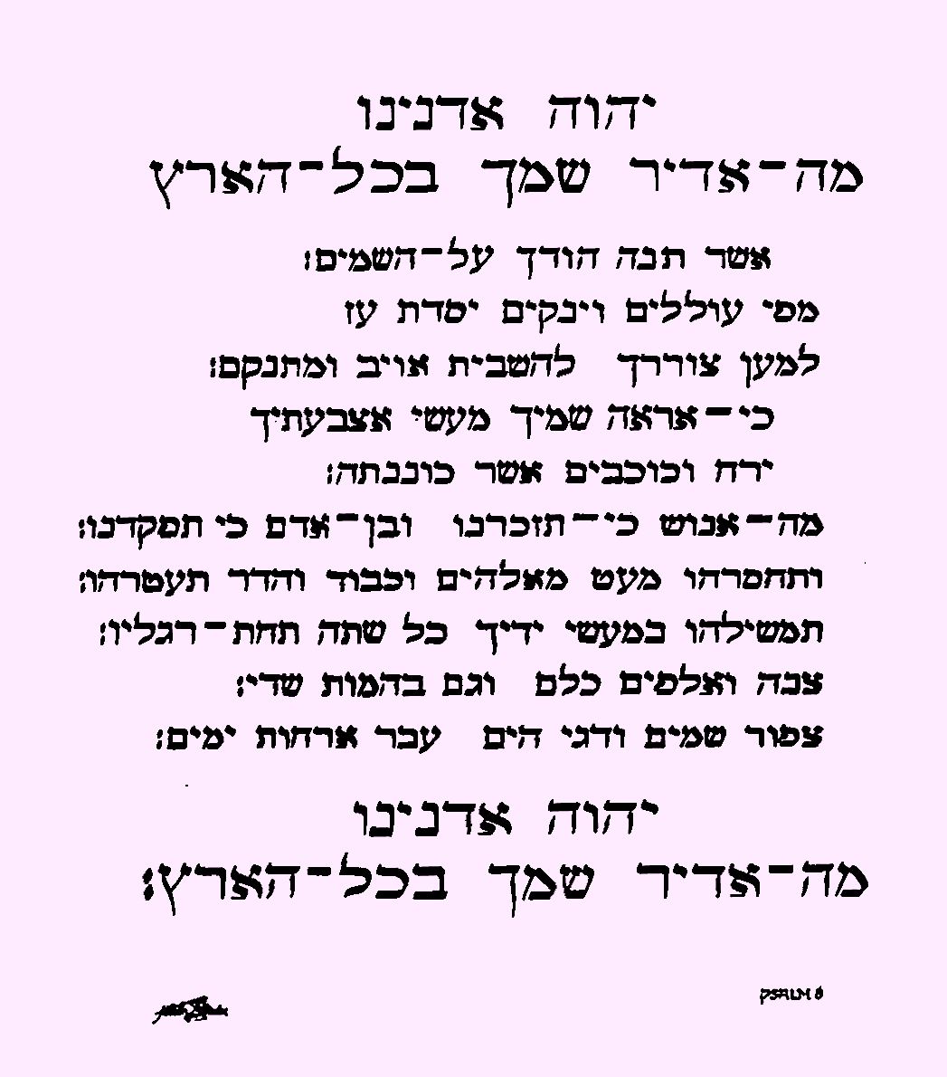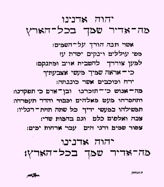 Der 8. Psalm in hebräischer Schrift. Zwar war der Schreiber ein Schriftgelehrter, jedoch nicht im Hebräischen. Eine schwierige Aufgabe, selbst wenn er die Textbedeutung kannte. Er konnte ja nicht lesen, was er hebräisch schrieb und somit auch nicht allein beurteilen, ob alles „haargenau“ und fehlerfrei war. –