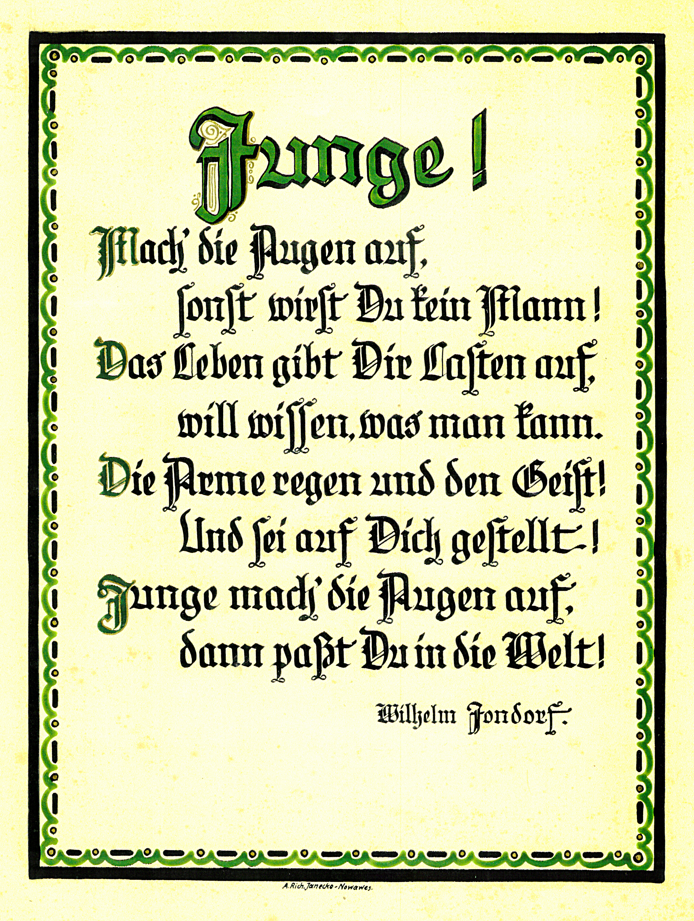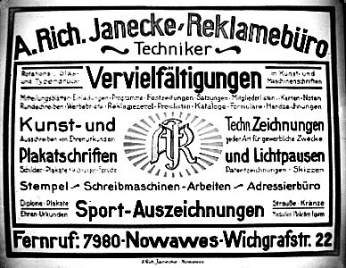 Richard Janecke begann im Alter von 14 Jahren die Ausbildung für das Zeichnen und die Retousche an der Graphischen Kunstanstalt des Herrn Baudouin im Berliner Südosten, Mathieustraße.
