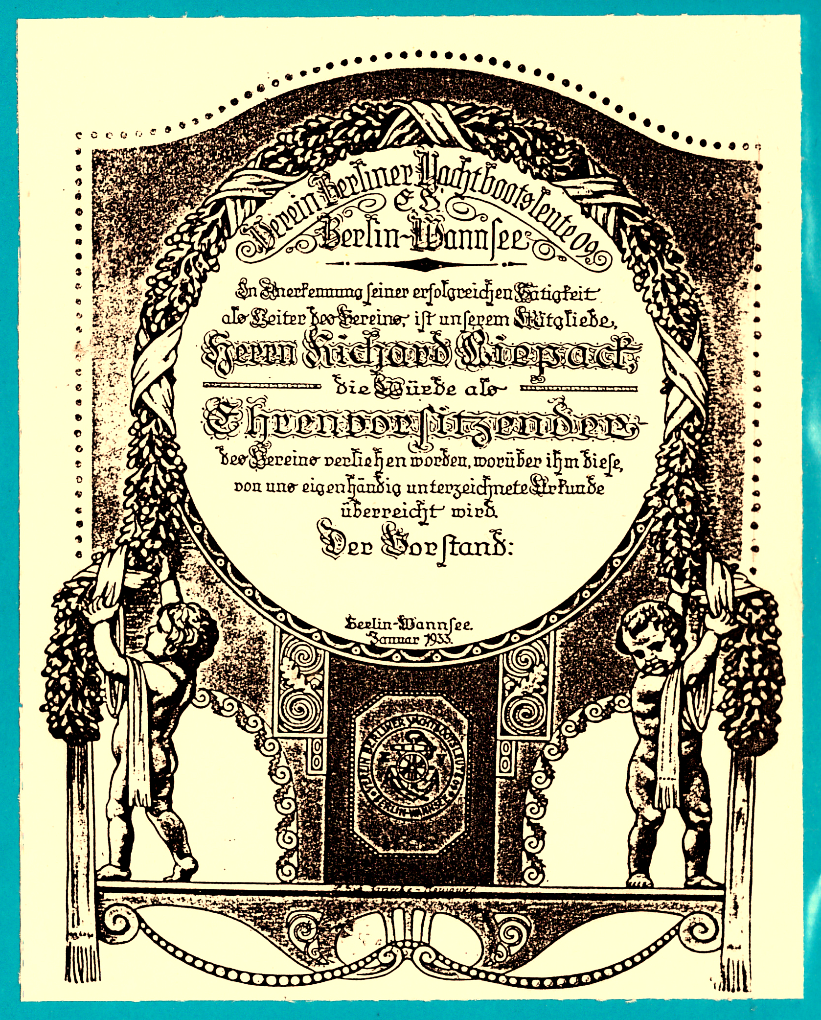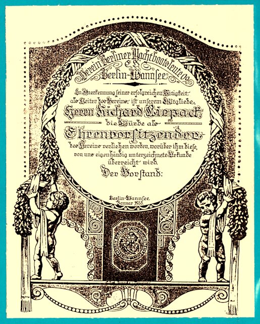 Auch der Verein für Yachtsboots-Leute verleiht Ehrenurkunden. Im Winter herrschen Eis und Schnee, da hat man die Zeit für solch Gedenken.