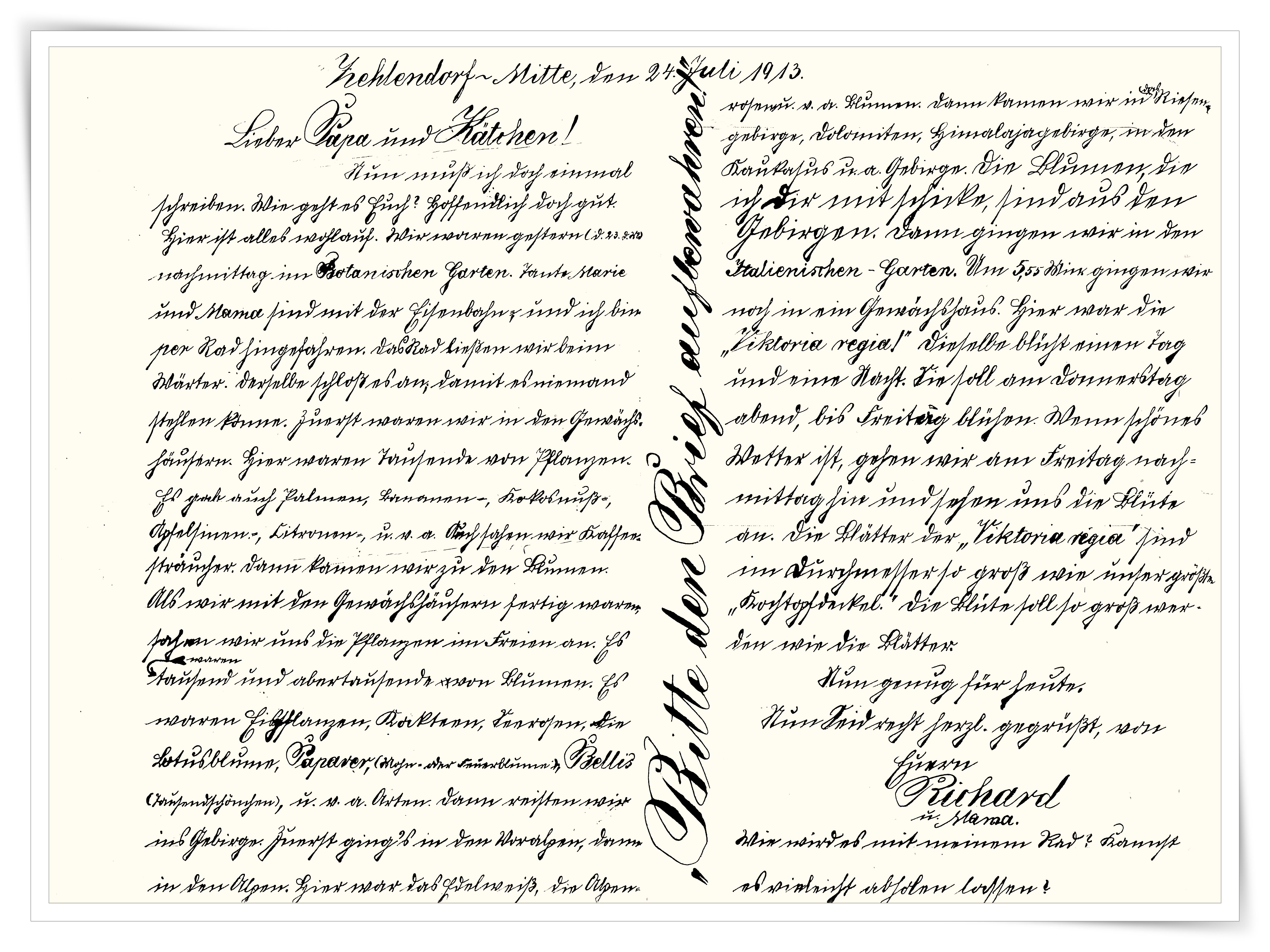 Familie Janecke lebt in jener Zeit im Berliner Stadtbezirk Neukölln. An diesem Sommer-Sonntag besuchen Mutter Clara und ihr Sohn Richard den Botanischen Garten. In einem Brief an seinen Vater und die Schwester berichtet der 12-jährige Schüler, provisorisch am Tisch der Gaststätte sitzend, über ihre Erlebnisse in den Kunst-Gartenanlagen.